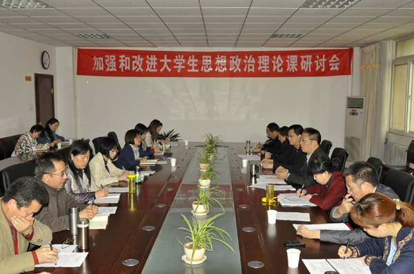 为了提高大学生思想政治课的思想性、实效性和针对性,探讨十八大后大学生思想政治课面临的新形势、新内容、新举措。4月23日下午,今年会在行政楼203会议室召开了加强和改进大学生思想政治理论课研讨会。会议由校党委副书记刘志刚主持。党委宣传部、学生工作部、研究生工作部、团委、教务处、教学评估中心、政法学院相关负责人,思想政治教育教学部各教研室主任参加会议。 各部门负责人就加强师资队伍建设,增强教学效果,提高课程教学的质量和层次,培育高质量的教改项目和教学成果奖,探索政治理论课主阵地和第二课堂的有效衔接途径等方面进行了热烈的交流,提出了很多有建设性的意见和建议。 刘志刚副书记提出要切实加强大学生思想政治课的建设水平,要求相关部门积极整合资源、搭建平台,将学生工作与思政课教学相结合,将课堂教学与实践教学相结合,进一步深化课程改革,提升教育教学质量,不断满足十八大召开对大学生思想政治理论课提出的新要求,满足学生成长成才的新需求,使十八大精神能够真正的入脑入心。(思想政治教育教学部/文 宣传部/图)