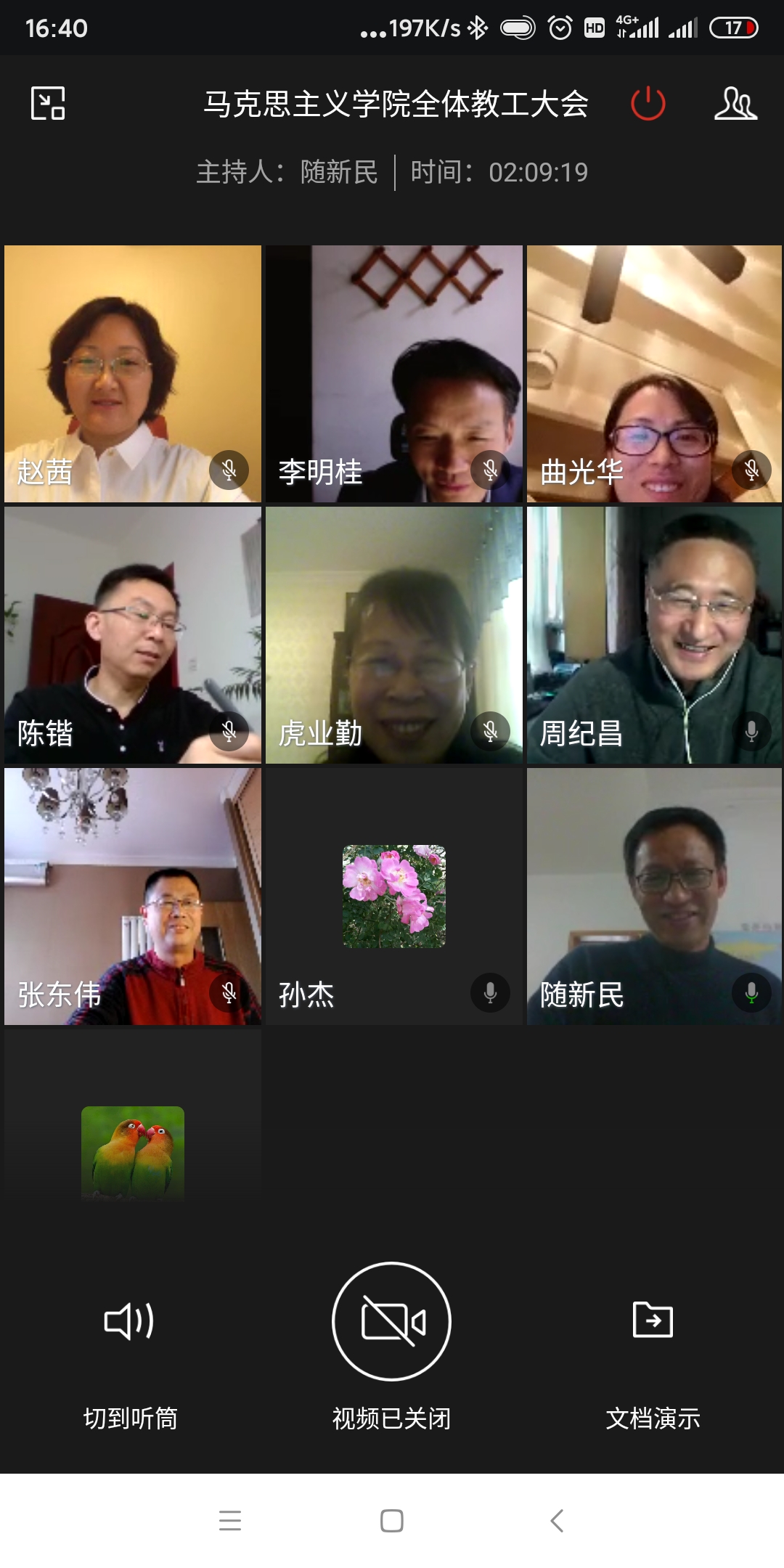 3月8日下午,今年会召开疫情防控工作网格管理工作推进视频会议,宣传部张东伟部长、曲光华副部长,社科处周纪昌处长、王雅副处长和全体成员,马院班子成员和全体教职工参加了会议。会议由院长随新民主持。