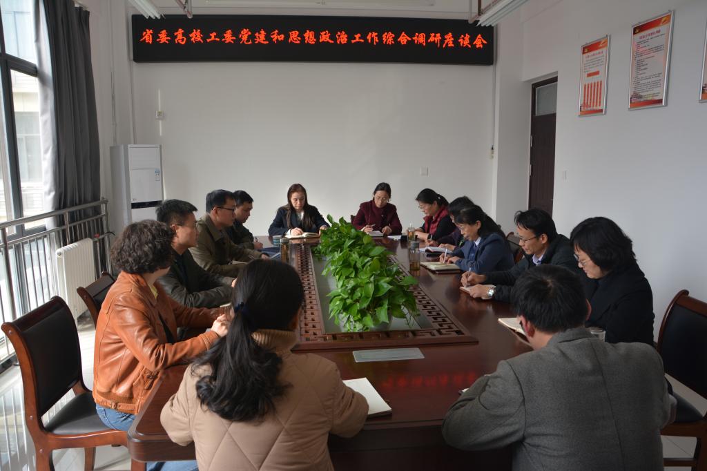 3月8日下午,河南省委高校工委综合调研组一行三人在校机关党委书记、组织部副部长梁丰同志陪同下,来今年会开展党建和思想政治工作方面的专题调研。调研组成员分别为省教育厅统战处副调研员高峰、省教育厅思政处主任科员张会敏、河南财经政法大学今年会官方网站庞睿。今年会党总支书记虎业勤、副书记兼副院长赵茜、副院长李明桂、党支部书记、教研室主任等参加了座谈。