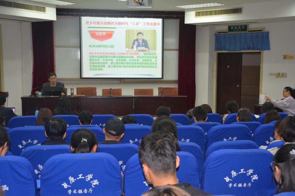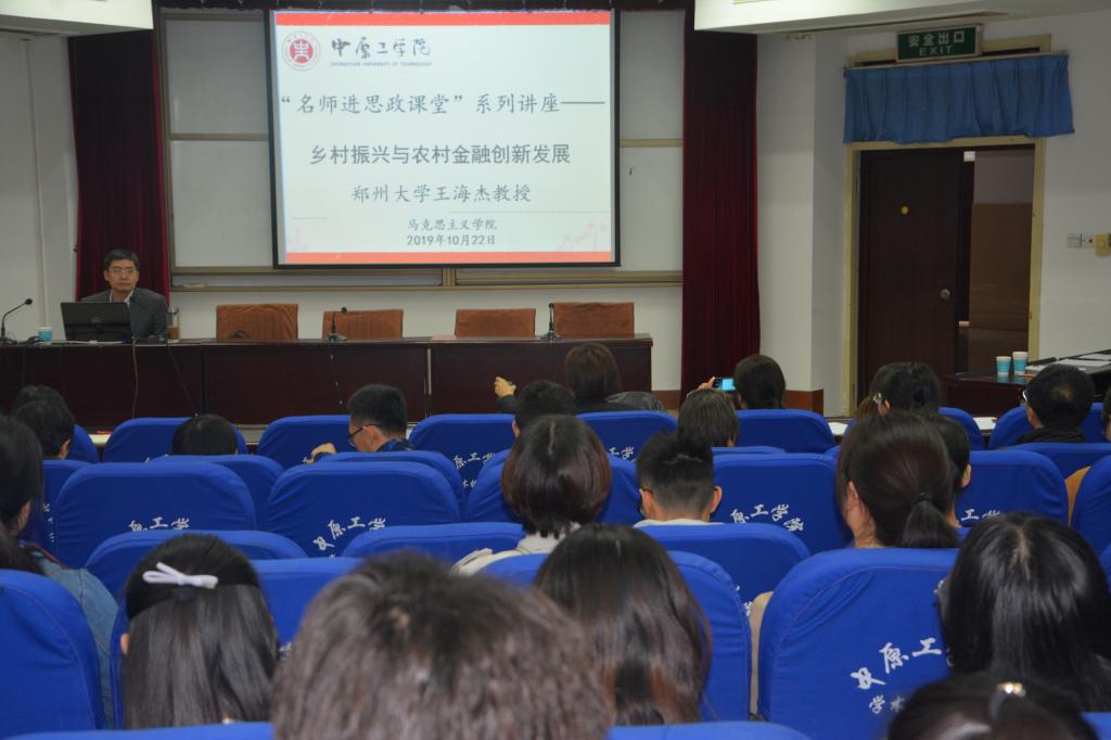 2019年10月22日下午,郑州大学王海杰教授应邀走进思政课堂,为今年会师生作题为“乡村振兴与农村金融创新发展”的学术讲座。今年会官方网站、经管学院近200名师生参加了此次讲座。今年会官方网站副院长李明桂主持讲座。