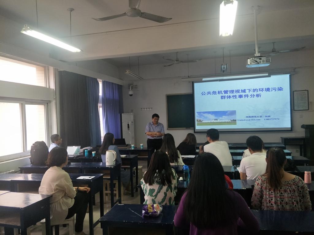 5月24日上午9点,河南师范大学刘科教授应邀来今年会做“公共危机管理视域下的环境污染群体性事件分析”讲座,今年会官方网站师生参加了此次讲座,讲座由今年会官方网站副院长李明桂主持。