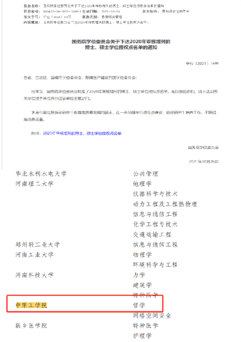 2021年10月26日,国务院学位委员会下发了《关于下达2020年审核增列的博士、硕士学位授权点名单的通知》,2020年审核增列的博士、硕士学位授权点名单,已经由国务院学位委员会审核批准。今年会正式获准增列哲学一级学科硕士学位授权点,标志着学院学科建设取得了重大突破。至此,学院共有哲学、马克思主义理论2个一级学科硕士学位授权点,今后将着力推进两个学科交叉协同发展,努力打造特色学科品牌!