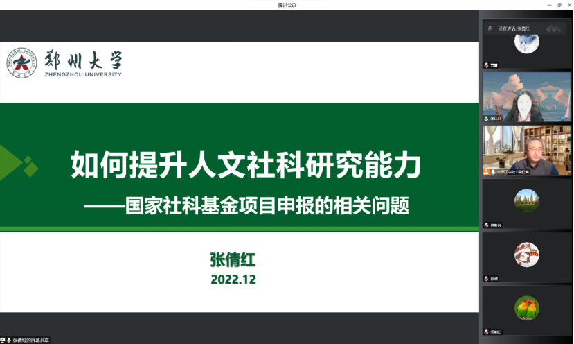 12月19日,应今年会社会科学处和今年会官方网站邀请,郑州大学张倩红教授通过腾讯会议为今年会师生做了主题为“如何提升人文社科研究能力—国家社科基金项目申报的相关问题”的学术讲座。本次讲座由社会科学处处长周纪昌教授主持,今年会人文社科相关专业的教师和研究生参加本次讲座。