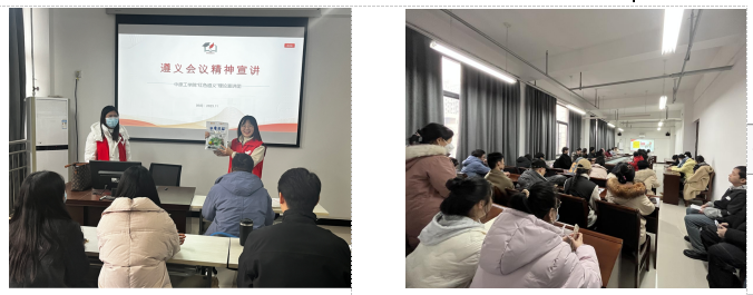 为深入学习贯彻习近平新时代中国特色社会主义思想和党的二十大精神,推进党史学习教育常态化,躬身践行伟大建党精神,发扬遵义会议精神,宣讲团成员通过生动的故事和身临其境的视频宣讲等形式带领经济管理学院、法学院等学院学生一起学习遵义会议的历史背景,在学习遵义会议精神内涵的同时鼓励他们将其精神内涵内化于心,外化于行,以严谨踏实的态度接稳时代的接力棒,做新时代的中工人。