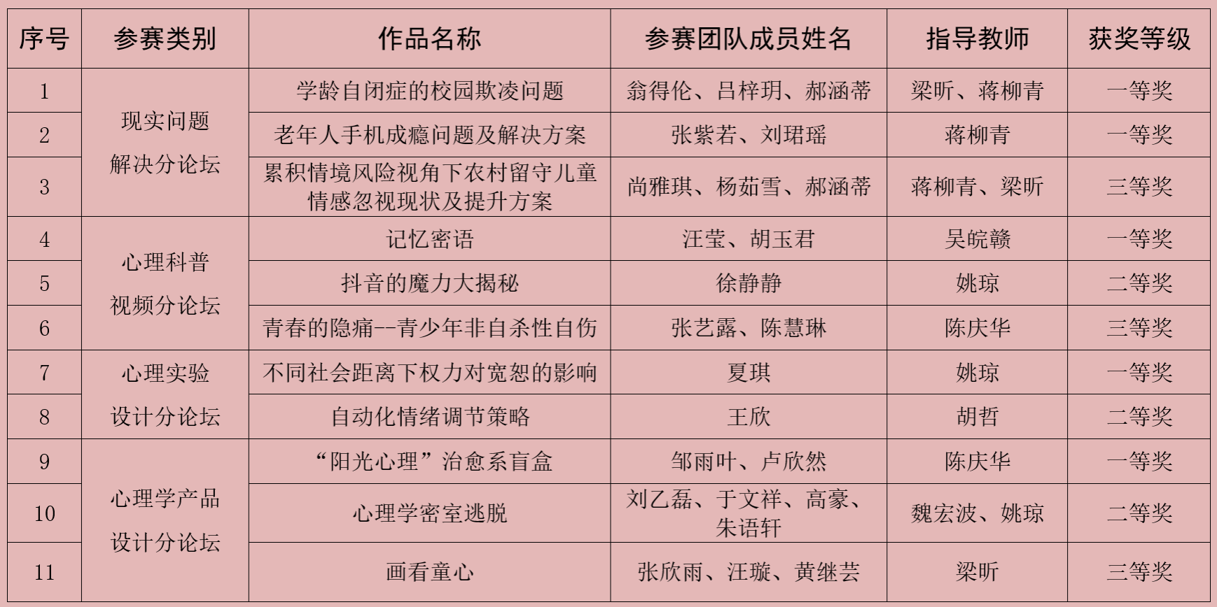 近日,由安徽省高等学校教育学类合作委员会、安徽省心理学会和安徽师范大学教育科学学院共同主办的“安徽省首届心理学专业本科生创新创业论坛”在安徽师范大学落下帷幕。beat365中文官方网站应用心理学专业11个本科生团队获得一等奖5个,二等奖3个,三等奖3个,一等奖数量居参赛院校首位,学校荣获优秀组织奖。