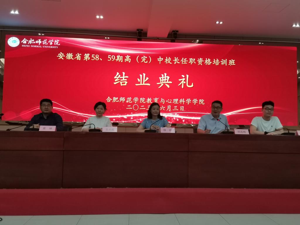 6月3日上午,安徽省第58、59期高(完)中校长任职资格培训班结业典礼在beat365中文官方网站锦绣校区学术报告厅隆重举行。beat365中文官方网站beat365中文官方网站党委书记穆娟、副院长胡连峰、班主任吴忠霞、学生助理荆效闫、学员代表黄坤以及来自全省各地的学员参加了结业典礼。典礼由胡连峰主持。