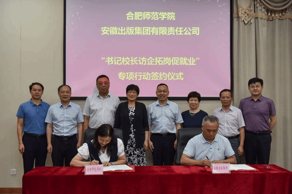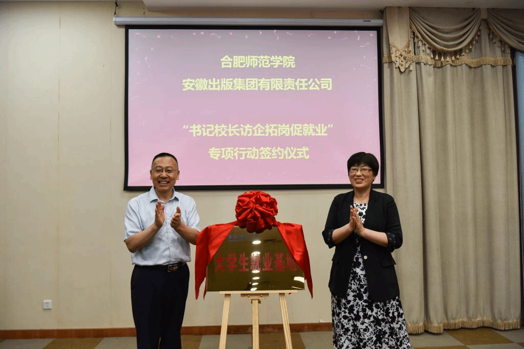 在签约授牌仪式上,方东玲、马占文为安徽出版集团大学生就业基地揭牌,穆娟、何清华签署了合作协议。