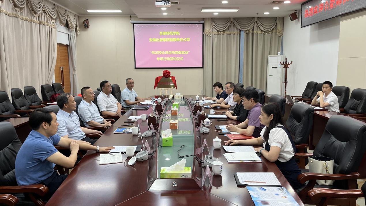 为深入贯彻落实党中央国务院关于“稳就业”“促就业”决策部署,进一步推进产教学研深度合作,7月9日下午,党委副书记、院长方东玲率队赴安徽出版集团有限责任公司开展“书记校长访企拓岗促就业”专项行动走访签约授牌活动。教师教育学院党委书记穆娟、院长李群、安徽省基础教育改革与发展协同创新中心执行主任钱立青、文学院党委书记李旺生等人陪同前往。安徽出版集团党委书记、董事长马占文、党委副书记袁超、党委委员、时代出版传媒股份有限责任公司总经理郑可,时代出版传媒股份有限责任公司党群工作部主任何清华、安徽星报传媒有限责任公司社长王能玉热情接待了方东玲一行。