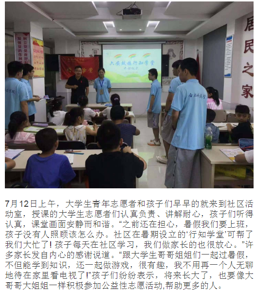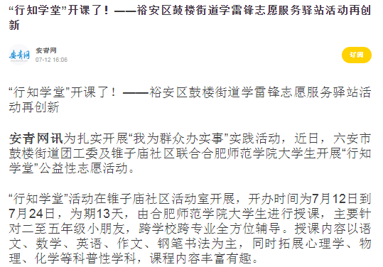 (本网讯)7月12日,教师教育学院“六安鼓楼行知学堂”在六安市鼓楼街道锥子庙社区顺利开班,小先生团队由我校教师教育学院、物理与材料工程学院以及安徽外国语学院、安徽新闻出版学院共8名小先生组成。课程内容包括党史学习、书法教学、心理辅导、素质拓展等。