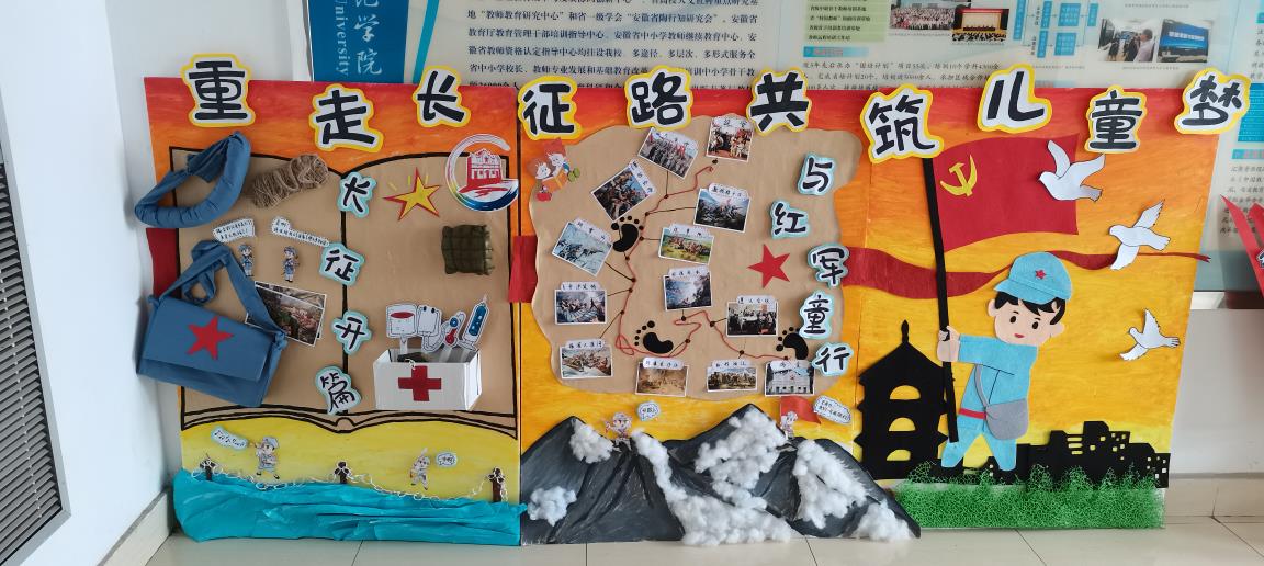 同学们结合专业教育实际,分为主题墙、图书角、益智区、表演区、美工区、游戏区等六个部分作为环创内容。其中,2020级学前教育专升本1班以“重走长征路,共筑儿童梦”为主题开展实践。