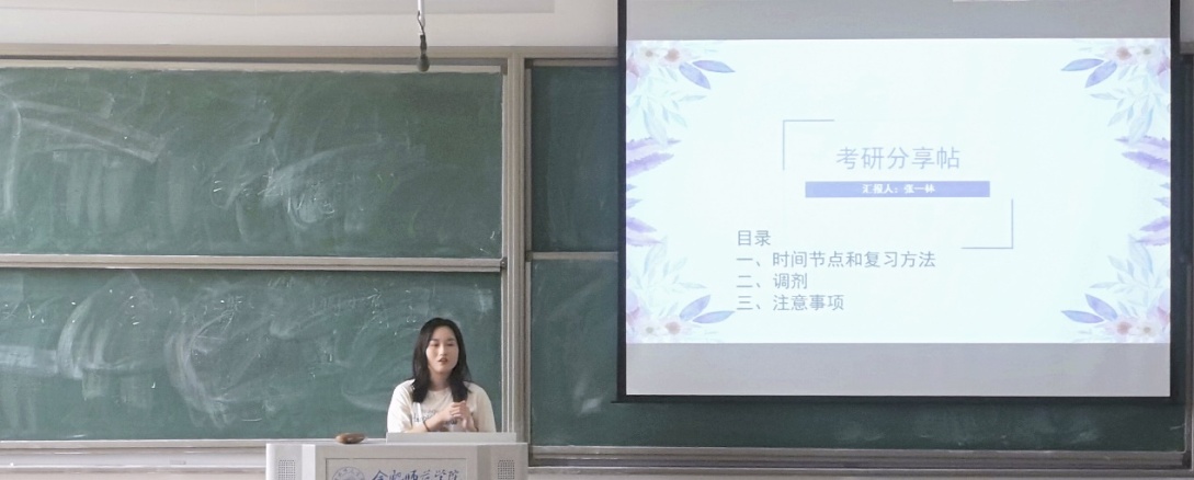 邰周怡考取了上海外国语大学的硕士研究生。会上,邰周怡详细介绍了考研信息的获取方法、考研流程、各科目复习方法以及缓解压力方法等,向同学们推荐了考研所需的复习资料、习题和文具,强调复习过程中记笔记、背诵的重要性,并结合自身实例列举了记笔记方法和背诵的技巧。