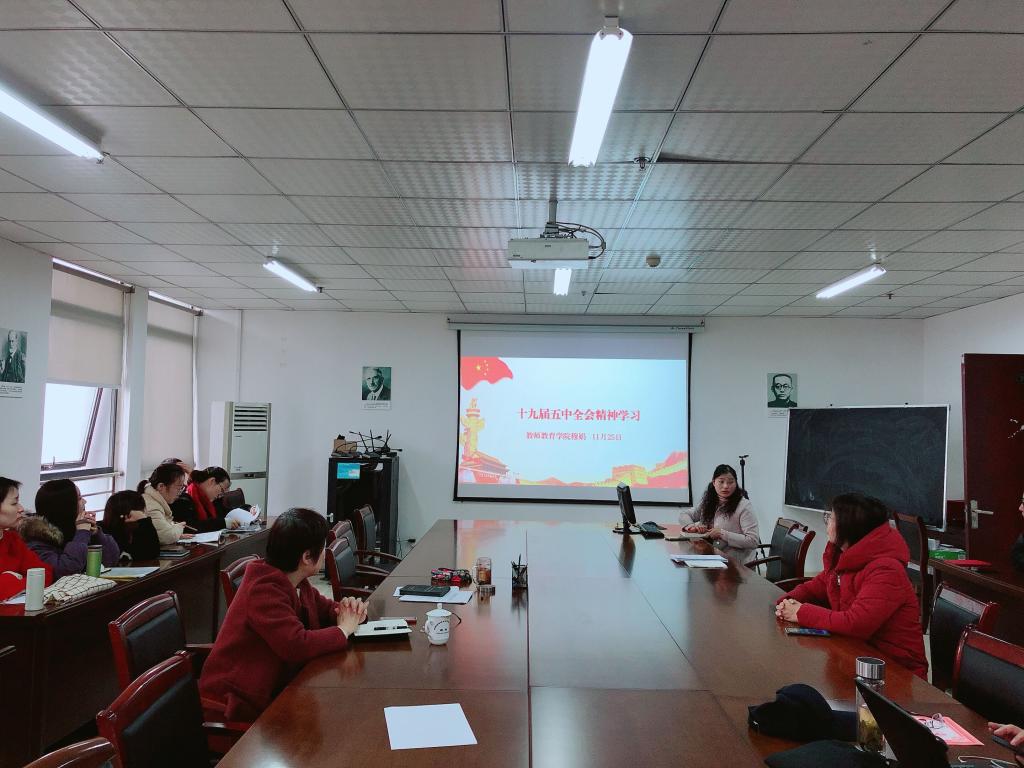 为学习宣传贯彻党的十九届五中全会精神,深入推进习近平新时代中国特色社会主义思想入脑入心,11月25日下午,教师教育学院党委组织全体教职工开展学习,学院党委书记穆娟主持会议。