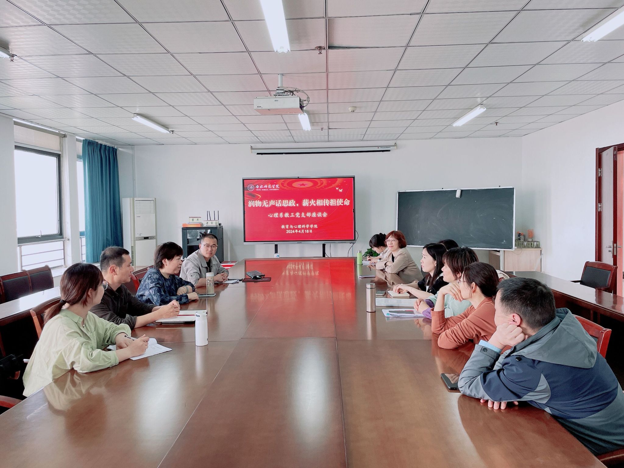 4月18日下午,beat365中文官方网站心理系教工党支部在锦绣校区行知楼710会议室召开“润物无声话思政,薪火相传担使命”主题座谈会。本次座谈会邀请即将荣休的李群教授主讲,心理系教工党支部全体党员参加会议,部分非党员教师列席会议,座谈会由支部书记黄凤主持。