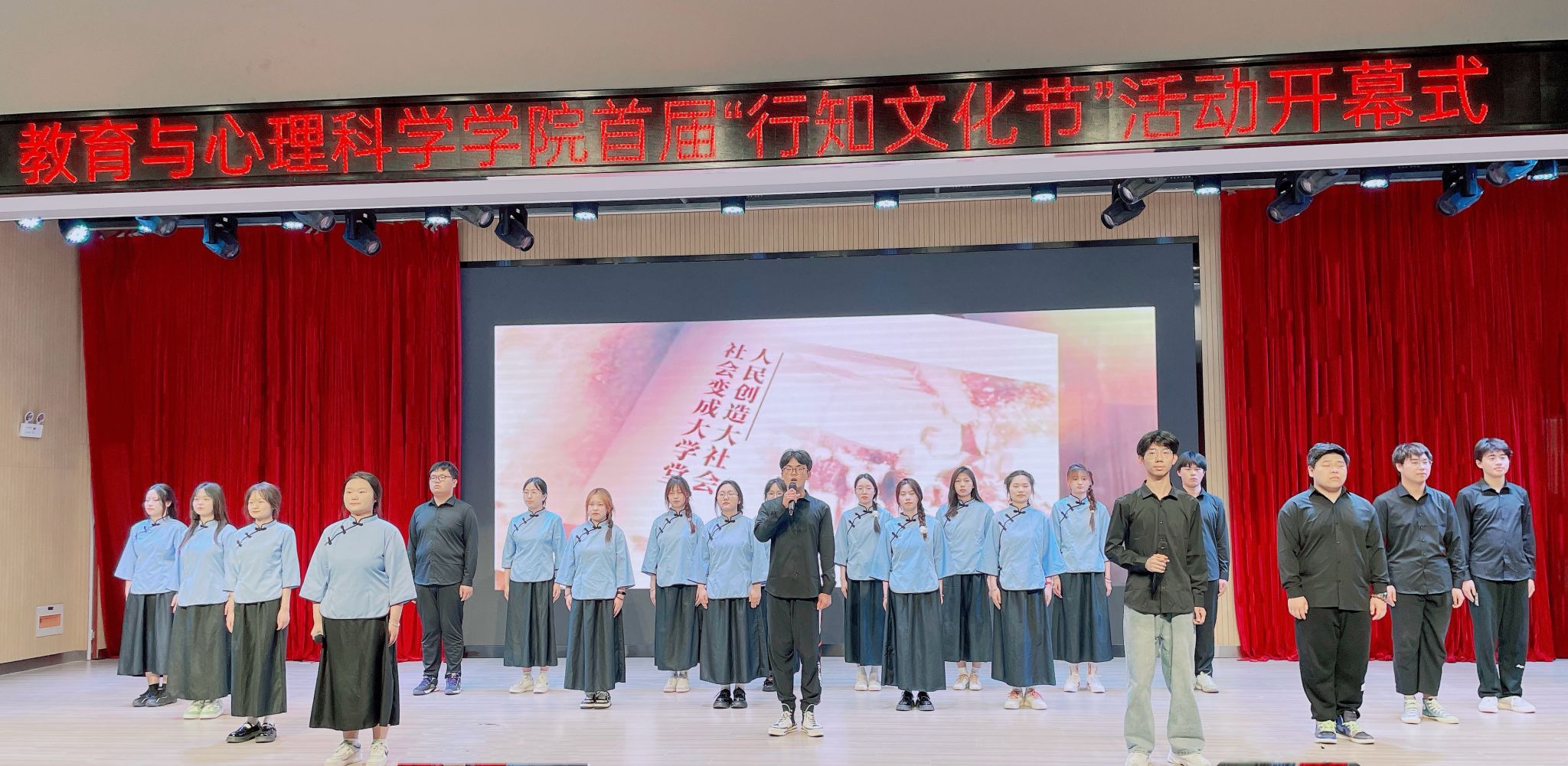 开幕式文艺表演在学前教育专业选送的幼儿韵律操《孩子的天空》中拉开帷幕,欢快的运动节奏、灵活的肢体语言展现了大学生昂扬向上的青春活力。附属西安路学校选送的课本剧《梅兰芳蓄须》,讲述了京剧大师梅兰芳先生蓄须明志的爱国故事,6位小学生的纯真演出,赢得了现场观众的阵阵掌声。学前教育专业选送的古典舞《茉莉花》,展现了学生们扎实的专业技能,优美的舞姿让现场观众如痴如醉。小学教育专业选送的空竹表演《水龙吟》,完美呈现了青年大学生对中华优秀传统文化的传承和创新。荣获安徽省第七届大学生艺术展演一等奖的原创音乐剧《燃灯远山 守望未来》讲述了合师学子扎根基层,积极服务乡村教育的感人故事,学生们将支教老师与留守儿童的师生情谊演绎的感人至深。随后,2020级两位优秀学生代表进行了精彩发言,今年以407分笔试成绩、专业第一优势,成功考取南京大学硕士研究生的杨云康同学分享了自己在行知文化引领下奋发向上、追求卓越的成长经历;荣获第九届“田家炳杯”全国师范院校师范生教学技能竞赛一等奖等80余项奖项获得者的王雅娴同学,讲述了自己以行知精神为引领,在追寻行知的道路上育师德、养师爱、学师才、练师能的奋斗人生。应用心理学专业选送的朗诵《四季行知》,充分展现了陶行知先生的教育思想和开拓求新的创造精神。学院合唱团带来的歌曲《红心牵绊 母子情长》和《校歌》,婉转流长,气势磅礴,唱出了教院学子奋勇争先的青春华章,为开幕式艺术表演画上圆满句号。