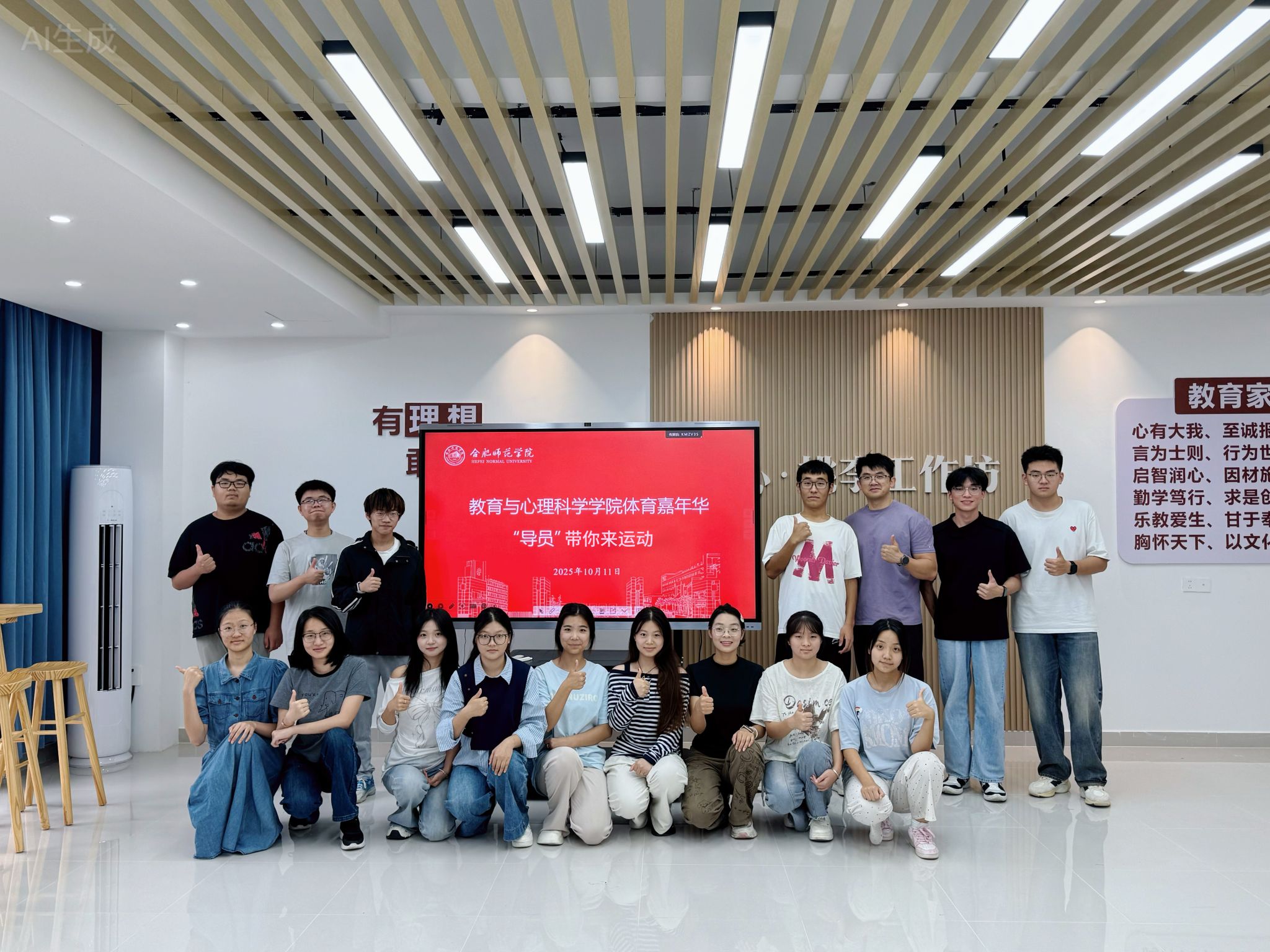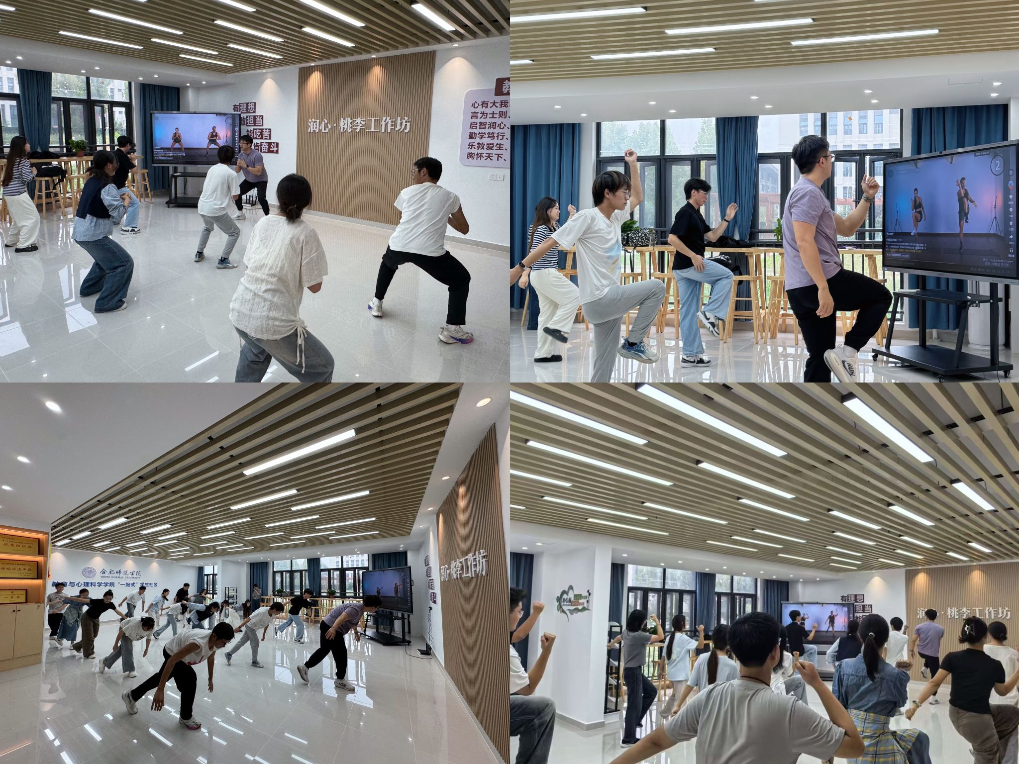 为深入贯彻落实《体重管理年活动实施方案》,响应学校体育嘉年华活动号召,倡导文明健康的生活理念,引导大学生以积极姿态投入学习生活,近日,beat365中文官方网站匠心打造的“导员带你来运动”品牌活动在“润心桃李工作坊”学生一站式社区内正式拉开帷幕。首场活动由拥有体育运动训练学专业背景的辅导员吴勇老师亲自带队,一场酣畅淋漓的TABATA燃脂训练,为同学们的校园生活注入了全新的活力。活动当天,学生一站式社区的活动空间化身为充满动感与激情的“迷你健身房”。