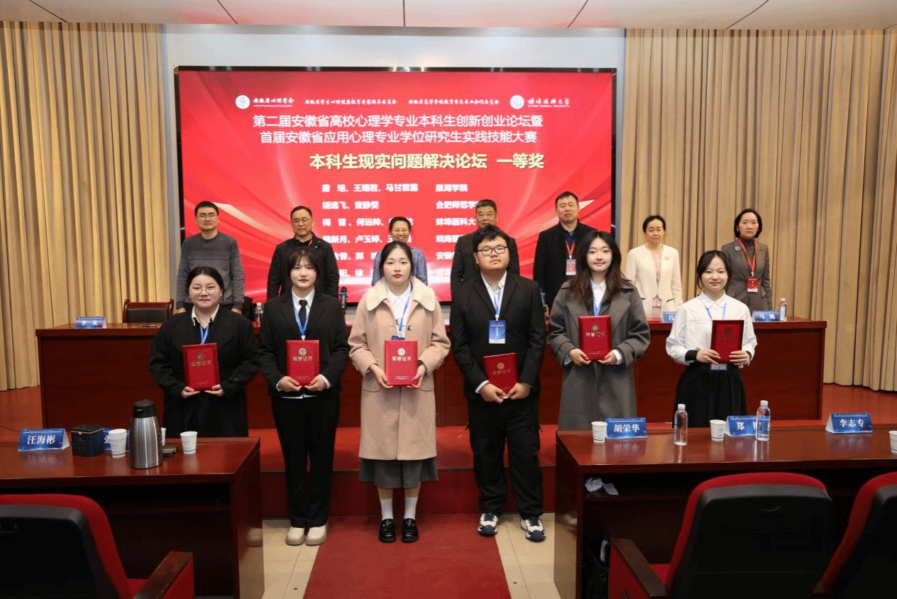 3月8日至9日,由安徽省心理学会、安徽省学生心理健康教育专家指导委员会、安徽省高等学校教育学类专业合作委员会、蚌埠医科大学主办的“第二届安徽省高校心理学专业本科生创新创业论坛暨首届安徽省应用心理专业学位研究生实践技能大赛”在蚌埠医科大学落下帷幕。beat365中文官方网站应用心理学专业8个本科生团队获得一等奖2个,二等奖4个,三等奖2个,学院荣获优秀组织奖。