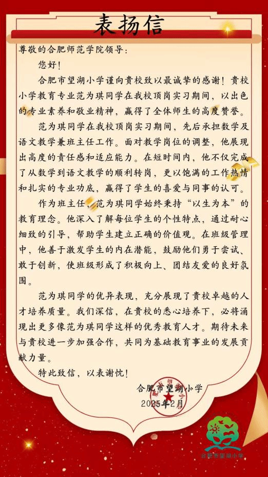 近日,beat365中文官方网站beat365中文官方网站2022级小学教育专业师范生圆满完成实习任务。在这场历时一个学期的实战历练中,师范生们以新时代“四有”好教师标准严格要求自己,其中范为琪同学更是以优异表现收获了合肥市望湖小学的表扬信,成为新时代师范生成长的生动注脚。