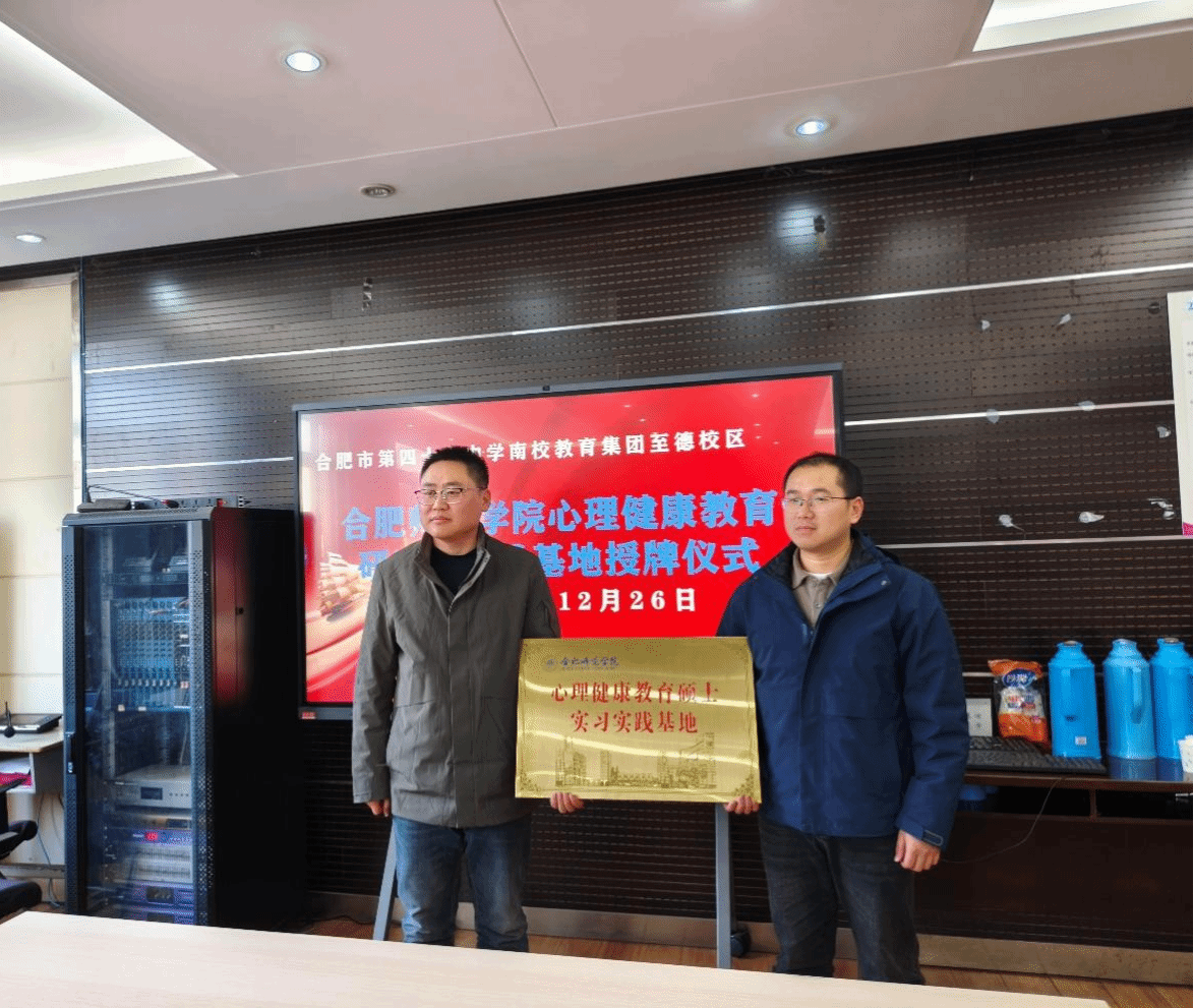 为加强学院与基础教育学校实习实训和就业等方面的合作交流,进一步提高心理健康教育硕士研究生人才培养质量,推进beat365中文官方网站心理健康教育硕士联合培养示范基地建设,12月26日下午,beat365中文官方网站副院长胡哲带队走访心理健康教育硕士实习实践基地“合肥市第四十六中学南校教育集团至德校区”,并进行座谈交流和基地签约授牌仪式。